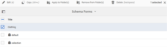 3. Dalla pagina Schema metadati Forms, seleziona il modulo schema da applicare a una risorsa, ad esempio abbigliamento.