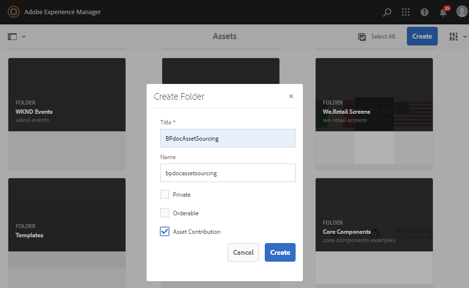 Experience Manager Assets administrators and non-admin users with permission to create a new folder can create a contribution folder in Experience Manager Assets.