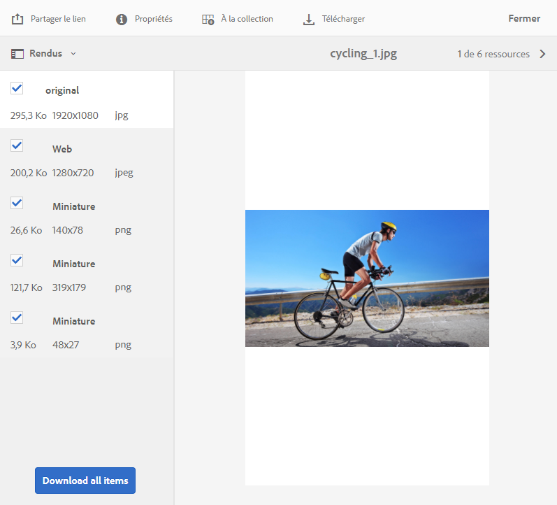 Les utilisateurs de Brand Portal peuvent télécharger plusieurs ressources, dossiers contenant des ressources et collections depuis l’interface de Brand Portal.