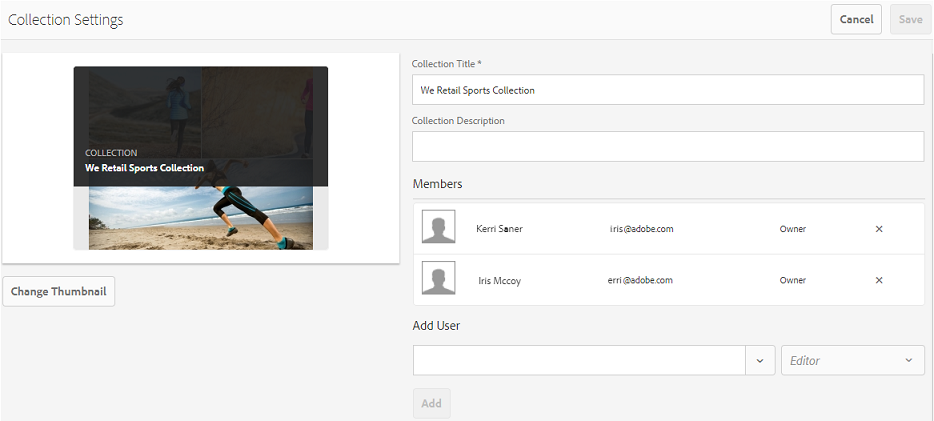 在 收藏集设置 对话框中,选择要与其共享收藏集的用户,并为用户选择与其全局角色匹配的角色。 例如,将编辑者角色分配给全局编辑者,将查看器角色分配给全局查看者。