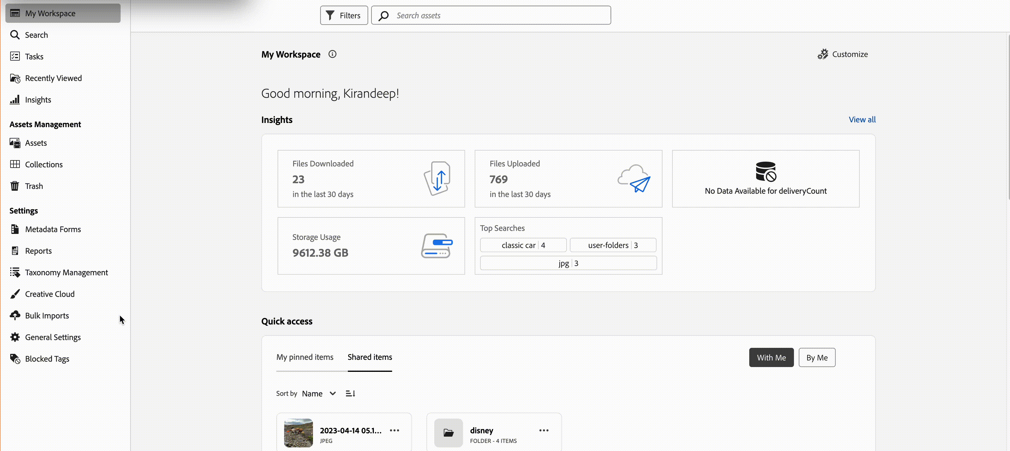 Vous pouvez également filtrer les résultats de la recherche en fonction de critères spécifiques relatifs aux métadonnées et au type de ressources. Pour les filtres fréquemment utilisés, Assets view permet d’enregistrer les paramètres de recherche afin d’améliorer l’expérience de recherche. Vous pouvez ensuite sélectionner la recherche enregistrée pour l’utiliser et appliquer le filtre, en un seul clic.