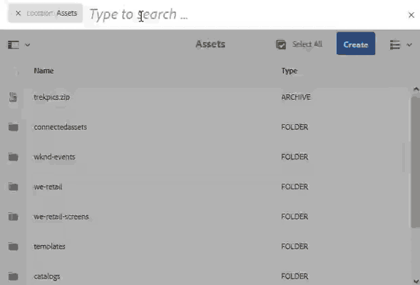 Return aus. Alternativ können Sie die Keyword-Tastenkombination / (Schrägstrich) verwenden, um das OmniSearch-Feld zu öffnen. Location:Assets ist vorausgewählt, um die Suche auf DAM-Assets zu begrenzen. Path:/content/dam wird auch angezeigt, wenn Sie eine Suche auf der Stammebene innerhalb des Ordners Dateien durchführen. Wenn Sie zu einem anderen Ordner navigieren, wird Path:/content/dam/<folder name> im OmniSearch-Feld angezeigt, um den Suchbereich auf den aktuellen Ordner zu beschränken. Experience Manager liefert Vorschläge, sobald Sie mit der Eingabe eines Suchbegriffs beginnen.