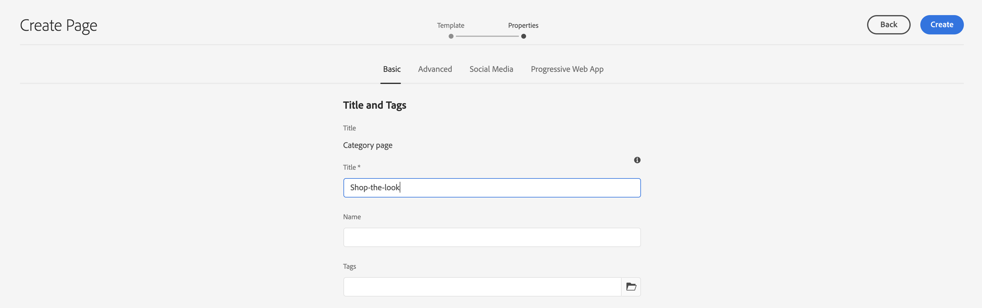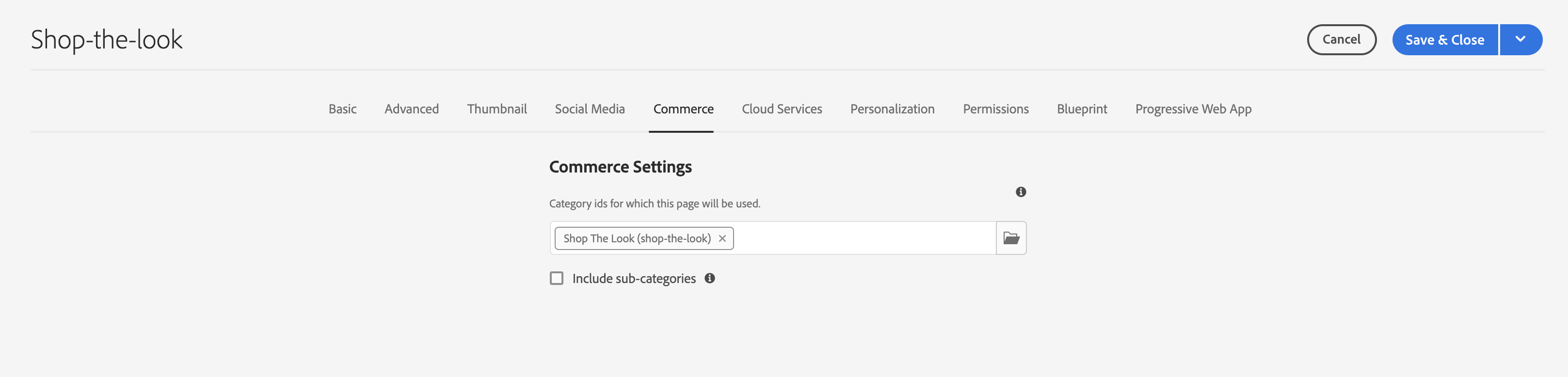 次に、このテンプレートを具体的なカテゴリに割り当てる必要があります。ページ情報 メニューでプロパティを開き、「コマース」タブに切り替えます。フォルダーアイコンをクリックして、カテゴリピッカーから 商品の陳列 カテゴリを選択します。チェックボックスをオンにすると、1 つのテンプレートに複数のカテゴリを割り当てたり、サブカテゴリも含めたりできます。