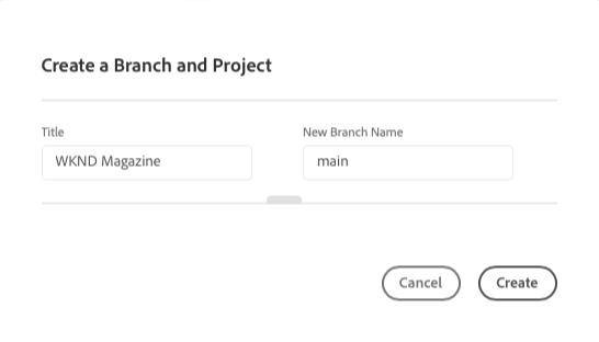 Cliquez sur Créer pour démarrer l’assistant et confirmez le Titre et le Nom de nouvelle branche dans la fenêtre Créer une branche et un projet.