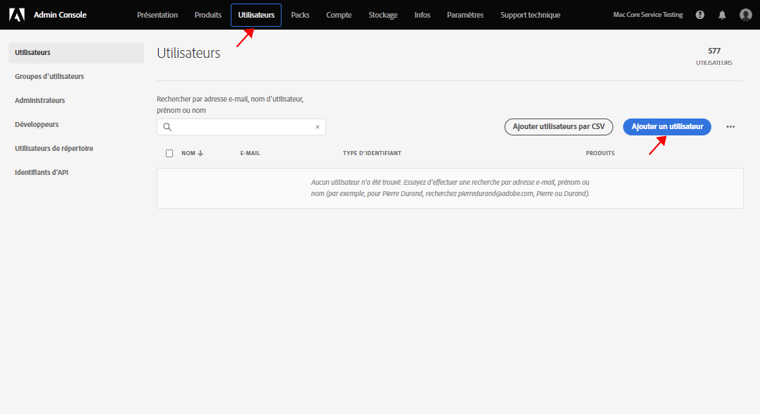 Pour affecter le développeur front-end aux profils corrects, appuyez ou cliquez sur l’onglet Utilisateurs puis sur le bouton Ajouter un utilisateur.