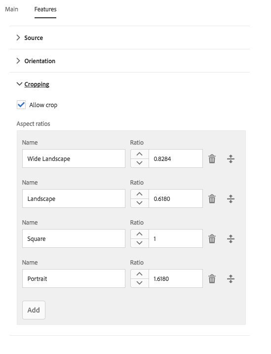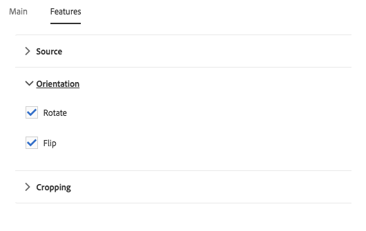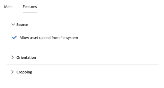On the Features tab you can define which options are available to the content authors when using the component including upload options, orientation, and cropping options.