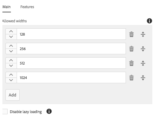 On the Main tab you can define a list of allowed widths in pixels for the image to automatically load the most appropriate width from the list.