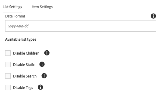 On the List Settings tab, the date format can be defined as well as what type of lists should be available in the component to the content authors.