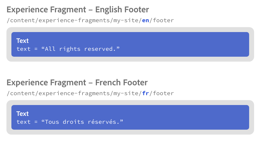 Because our hypothetical website is offered in English and French, we will need to create two Experience Fragments, both called footer in the locations we described previously.
