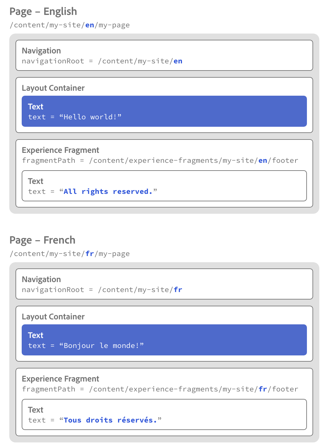 For example, the author would only need to add content such as a text component to the English and French pages (represented in blue below).