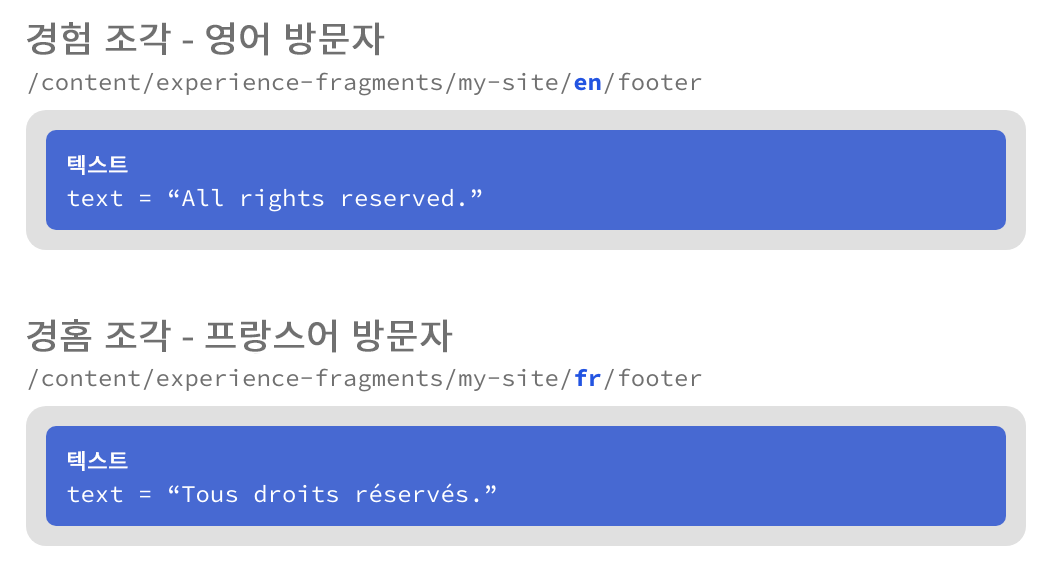 - 조각의 경로와, 현지화된 페이지 구조를 미러링하는 경험 조각의 구조를 기반으로 구성 요소는 현지화된 해당 콘텐츠를 자동으로 검색할 수 있습니다.
