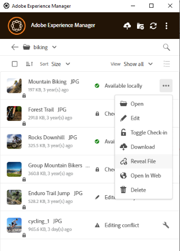 Adobe Experience Manager 데스크톱 앱을 사용하여 로컬 데스크톱의 Adobe Experience Manager DAM 저장소에 저장된 디지털 자산에 액세스합니다. 그런 다음 모든 데스크탑 애플리케이션에서 이러한 자산을 사용할 수 있습니다. 데스크탑 애플리케이션에서 자산을 로컬로 열고 편집할 수 있습니다. 변경한 후 버전 제어로 Experience Manager에 업로드하여 다른 사용자와 업데이트를 공유하십시오. 새 파일과 폴더 계층을 Experience Manager에 업로드하고 폴더를 만들고 Experience Manager DAM에서 에셋 또는 폴더를 삭제할 수도 있습니다.