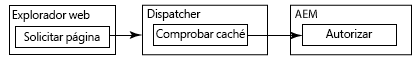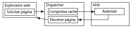 Dispatcher incluye el módulo AuthChecker que implementa el almacenamiento en caché con permisos confidenciales. Cuando el módulo está activado, Dispatcher llama a un servlet de AEM para realizar la autenticación del usuario y la autorización del contenido solicitado. La respuesta del servlet determina si el contenido se envía al explorador web desde la caché o no.