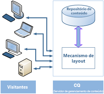 Se você usar um Servidor de gerenciamento de conteúdo, como o AEM, um mecanismo de layout avançado processa a solicitação de um visitante. O mecanismo lê o conteúdo de um repositório que, combinado com estilos, formatos e direitos de acesso, transforma o conteúdo em um documento adaptado às necessidades e direitos do visitante.