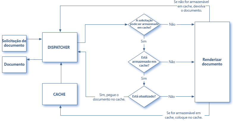 O Dispatcher armazena os arquivos em cache no servidor Web como se fossem parte de um site estático. Se um usuário solicitar um documento armazenável em cache, o Dispatcher verificará se esse documento existe no sistema de arquivos do servidor Web:
