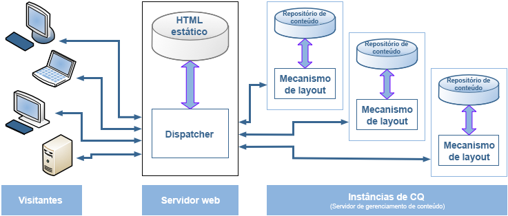 O Dispatcher contém mecanismos para gerar e atualizar HTML estático com base no conteúdo do site dinâmico. Você pode especificar em detalhes quais documentos são armazenados como arquivos estáticos e quais são sempre gerados dinamicamente.