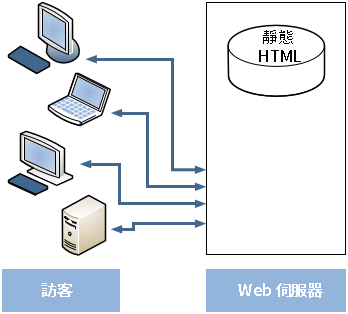 靜態網頁伺服器 (例如 Apache 或 IIS) 會為網站的訪客提供靜態 HTML 檔案。靜態頁面只需建立一次,之後會針對每項請求傳送相同的內容。