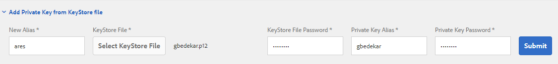 - "키 저장소 파일에서 개인 키 추가"를 클릭합니다.인증서와 관련된 별칭 및 암호를 지정합니다