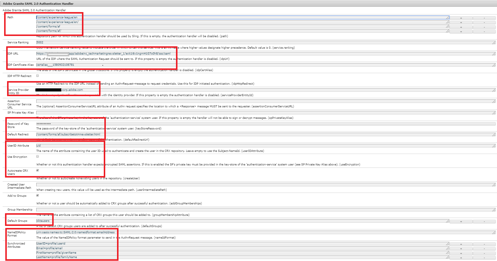 - Id. de entidad de proveedor de servicios: Este es el nombre de su servidor de AEM