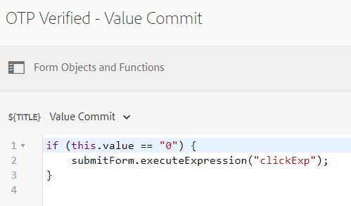 This form makes use of the POST invocation of the Form Data Model to verify the mobile number using OTP. The form’s submit action is triggered on successful verification of the mobile number using the following code. We are triggering the click event of the submit button named submitForm.