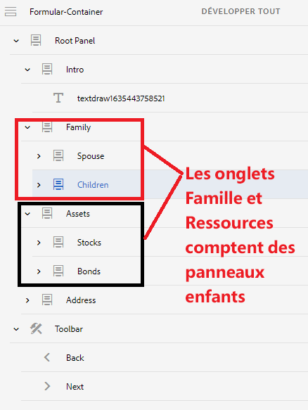Créez un formulaire adaptatif avec la structure suivante. Le panneau racine contient des panneaux enfants qui s’affichent sous forme d’onglets sur la gauche. Certaines de ces onglets" possèdent des panneaux enfants supplémentaires. Par exemple, l’onglet Famille comporte deux panneaux enfants appelés Épouse et Enfants.
