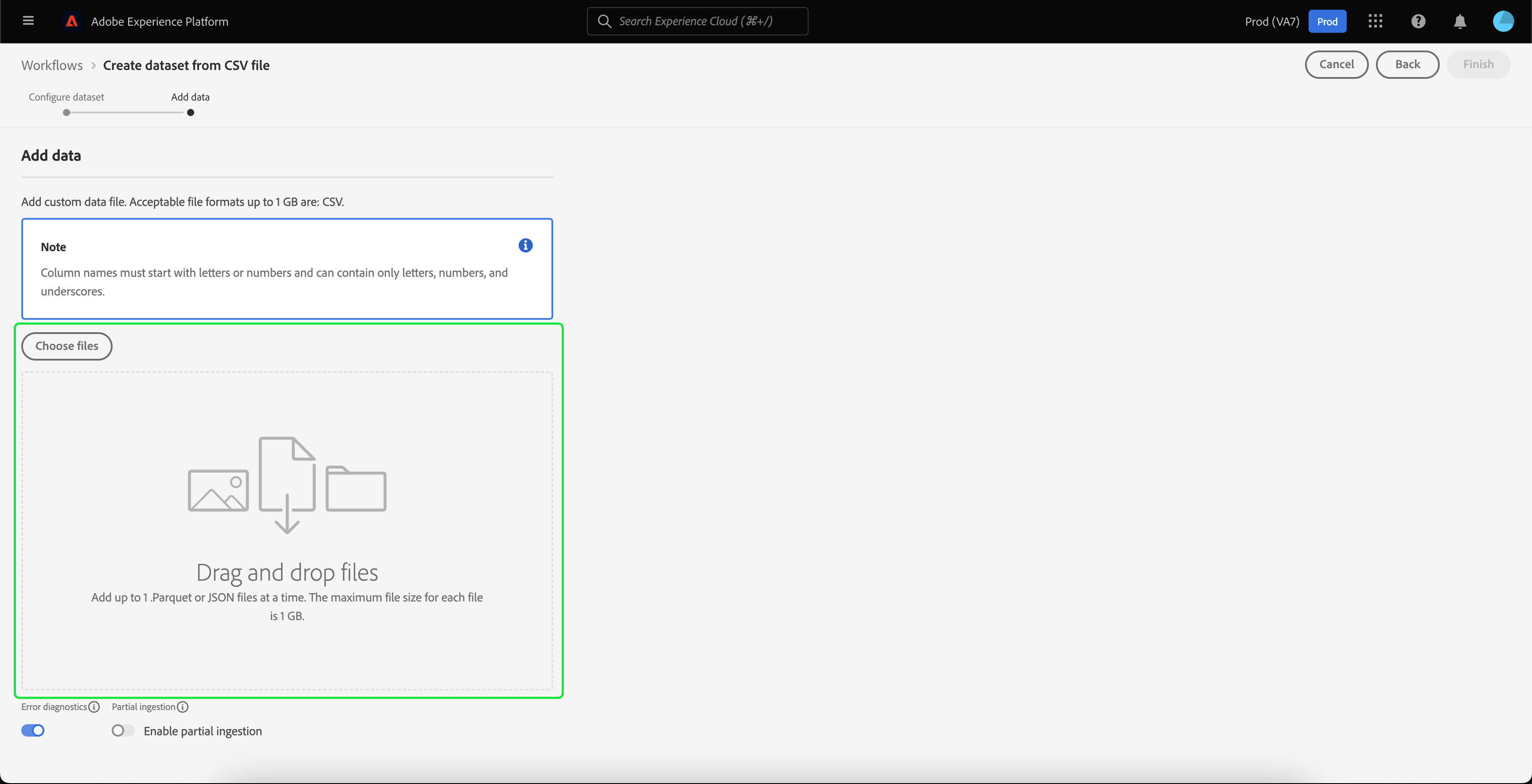 Der Bildschirm Daten hinzufügen wird angezeigt. Der Speicherort, an den Sie die CSV-Datei für den Datensatz hochladen können, ist hervorgehoben.