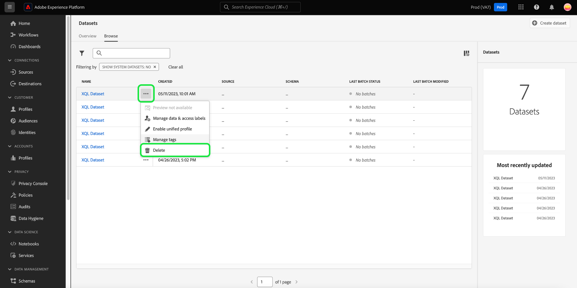 Datasets created and utilized by Adobe applications and services (such as Adobe Analytics, Adobe Audience Manager, or Offer Decisioning) cannot be deleted.