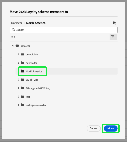 Move資料集至資料夾對話方塊就會顯示。 選取您要移動對象的資料夾,然後選取​Move。 快顯通知會通知您資料集移動成功。