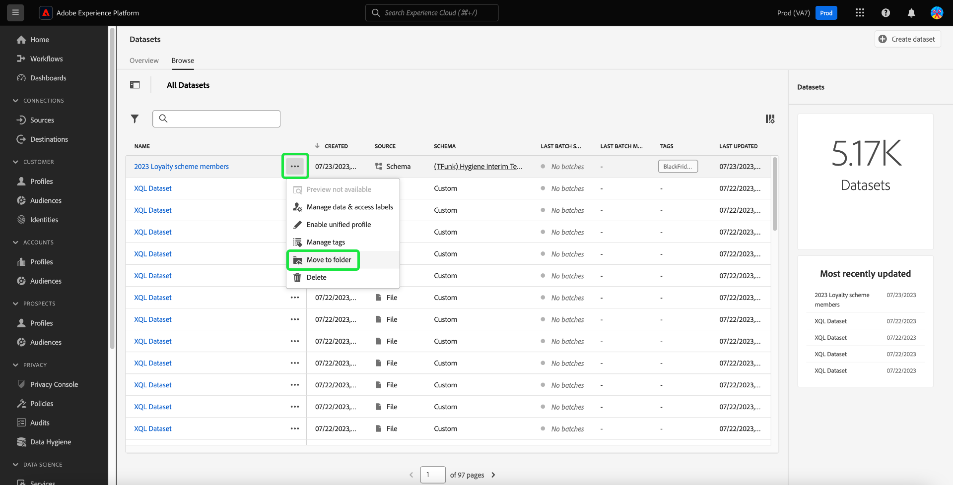 您可以將資料集放在資料夾中,以改善資料集管理。 若要將資料集移至資料夾,請選取您要管理的資料集名稱旁的省略符號(…),然後從下拉式選單中選取​Move to folder