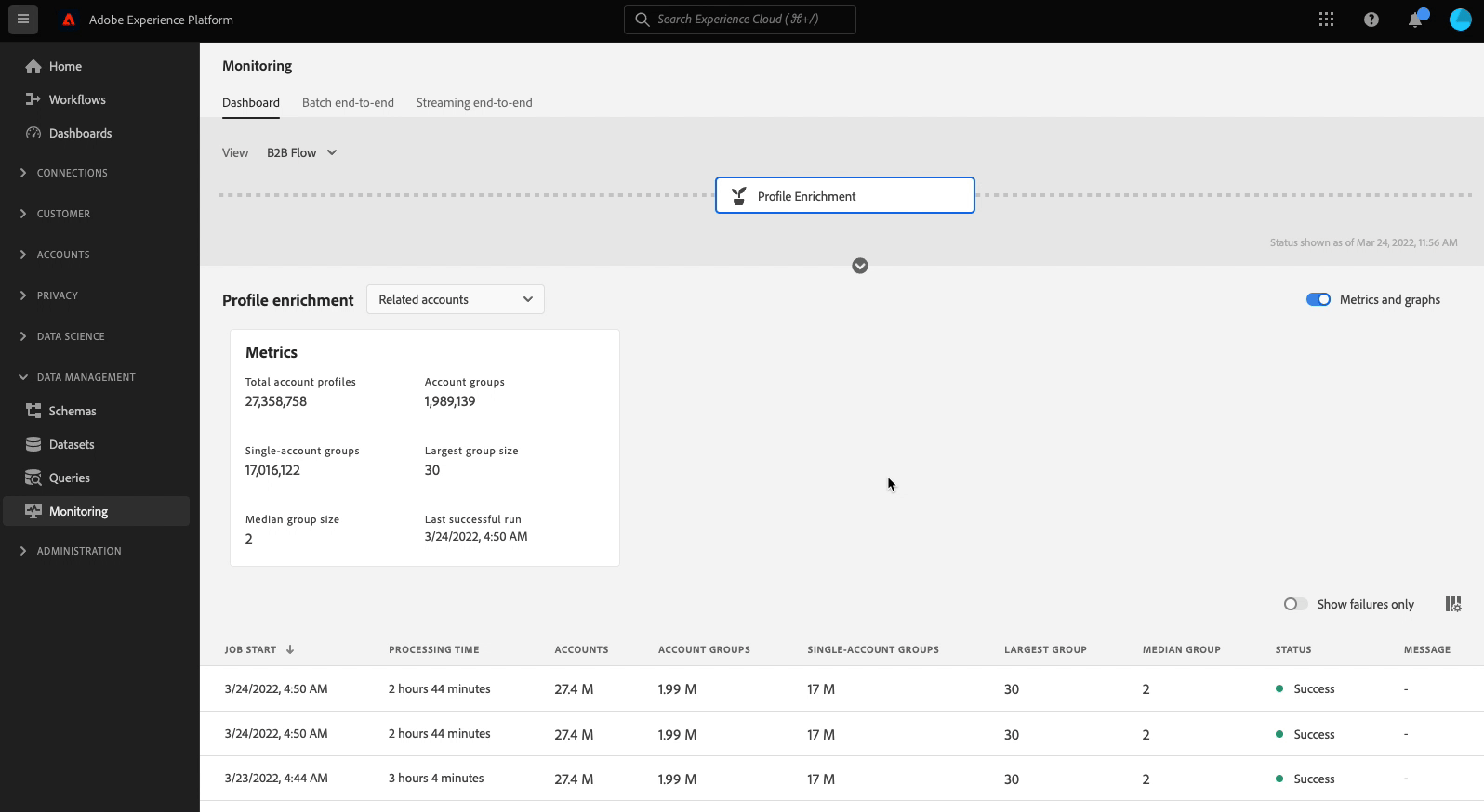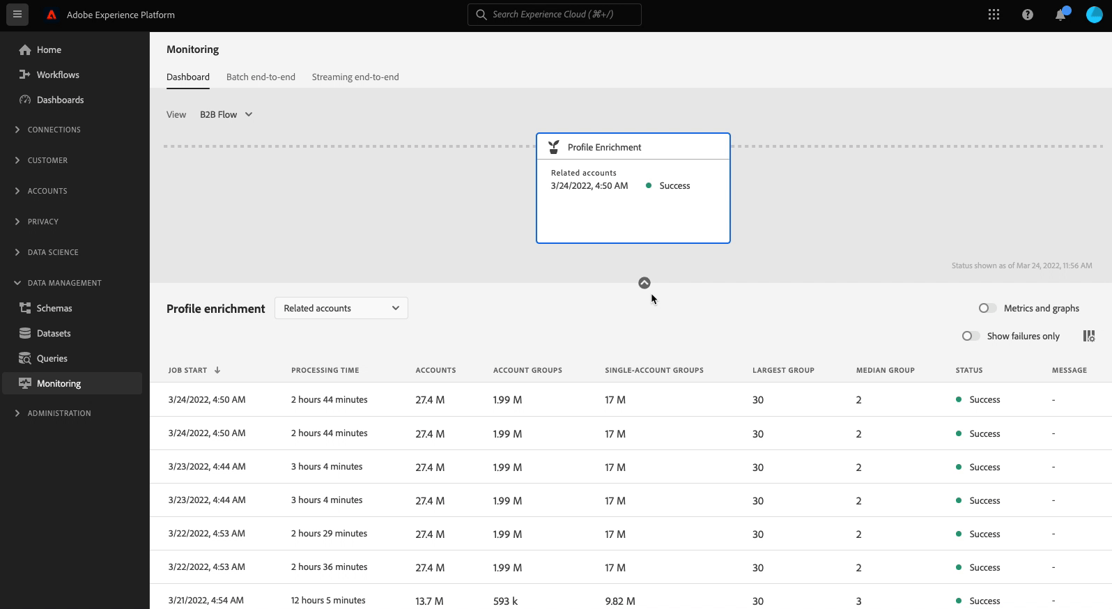 Utilice el panel Profile Enrichment para saber si los trabajos de enriquecimiento de perfiles se ejecutaron y finalizaron correctamente, y para ver las métricas básicas y medir la eficacia de los enriquecimientos.