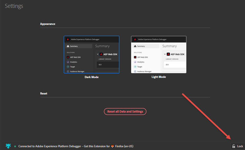 Experience Platform Debugger가 열린 후 설정(으)로 이동하여 어두운 모드(기본값) 또는 밝은 모드 를 선택하면 기본 설정 모양을 선택할 수 있습니다.