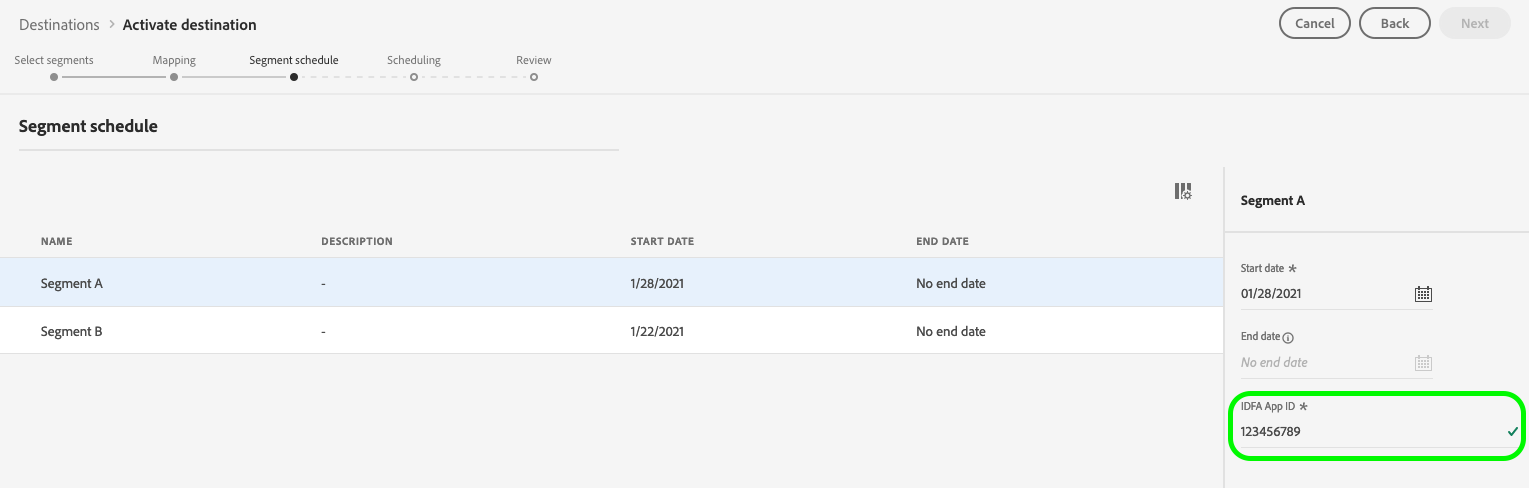 在 Segment schedule 步驟中,傳送App ID或IDFA對象給GAID時,您必須提供Google Customer Match。