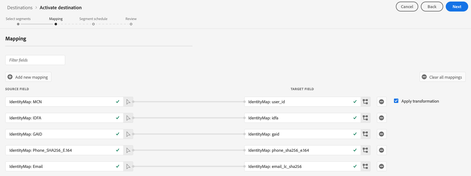 IDFA或GAID時,請選取IDFA或GAID名稱空間作為目標身分。 - 當您的來源名稱空間是自訂名稱空間時,請選取