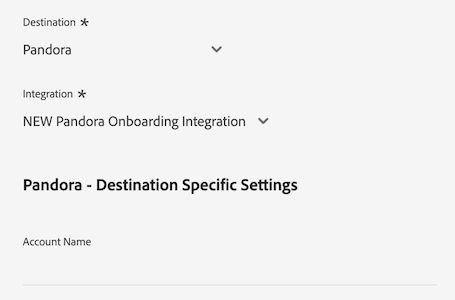 Imagem da interface do Experience Platform mostrando os campos de dados do cliente para o destino Pandora.