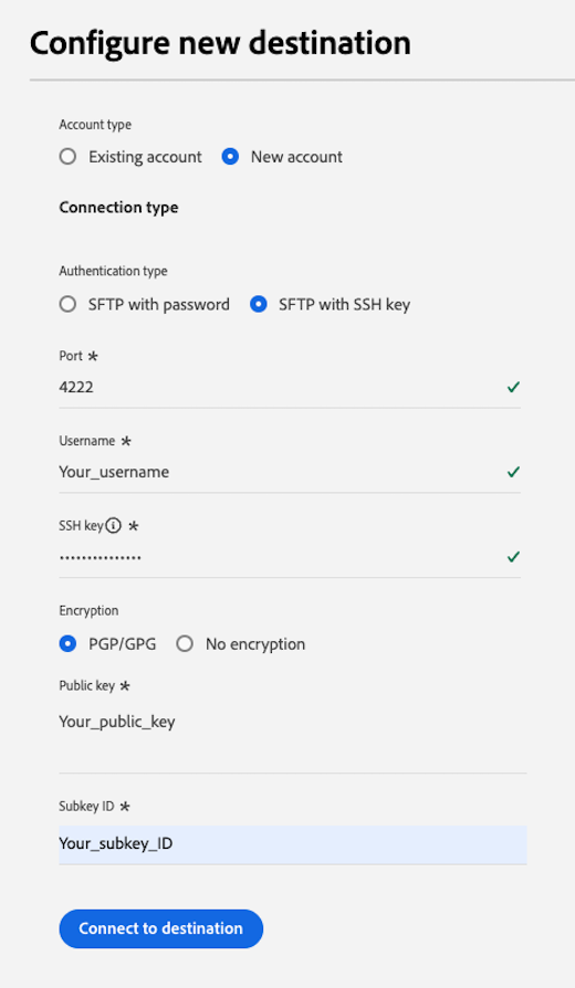Pour vous authentifier auprès de la destination, renseignez les champs requis et sélectionnez Connect to destination.