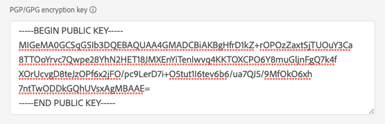 PGP/GPG encryption key : vous pouvez éventuellement joindre votre clé publique au format RSA pour ajouter un chiffrement à vos fichiers exportés. Vous pouvez voir un exemple de clé correctement formatée dans l’image ci-dessous.