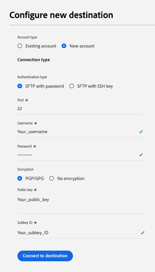 Fyll i de obligatoriska fälten och välj Connect to destination om du vill autentisera mot målet.