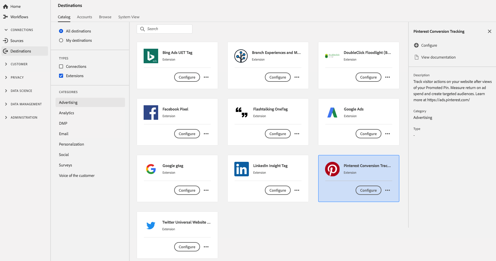 Experience Platformを購入したすべての顧客は、この拡張機能を Destinations カタログから利用できます。