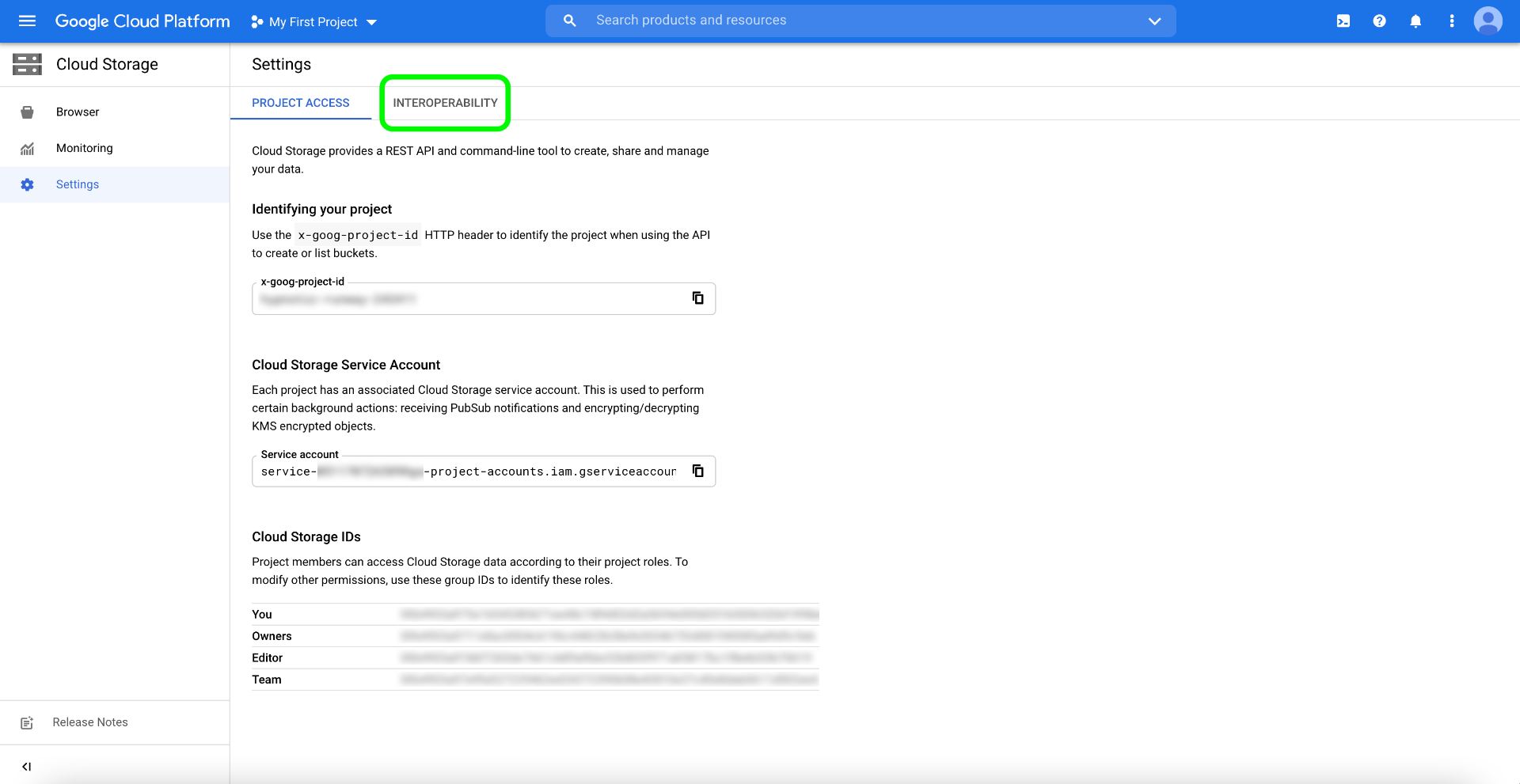 Settings ページが表示されます。 ここから、Google プロジェクト ID に関する情報と Google Cloud Storage アカウントの詳細を確認できます。相互運用性設定にアクセスするには、上部のヘッダーから「Interoperability」を選択します。