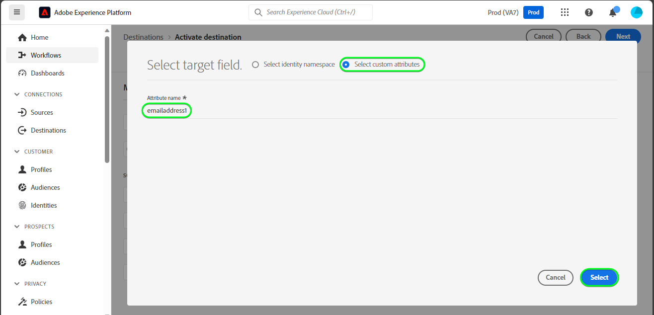 Im Schedule audience export Schritt des Aktivierungs-Workflows müssen Sie Experience Platform-Zielgruppen manuell dem benutzerdefinierten Feldattribut in Dynamics 365 zuordnen.