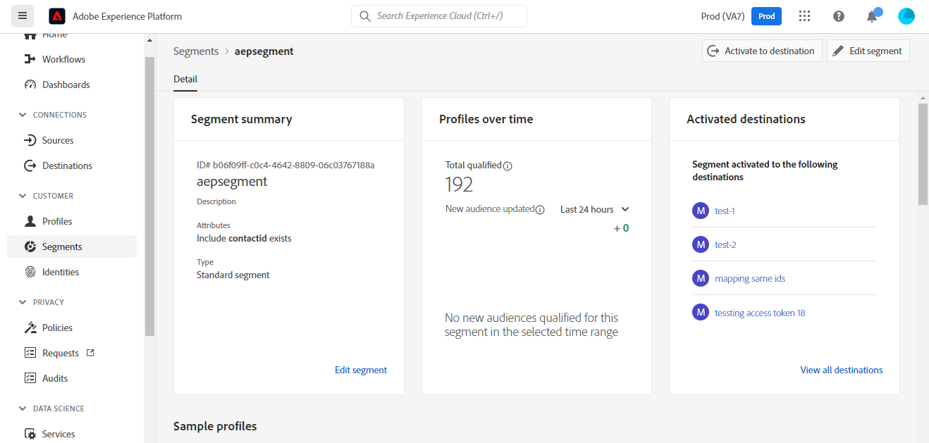 - För att aktivera data behöver du behörigheterna View Destinations, Activate Destinations, View Profiles och View Segments åtkomstkontroll. Läs åtkomstkontrollsöversikten eller kontakta produktadministratören för att få den behörighet som krävs.