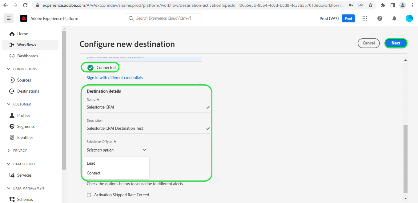 選取識別碼 (例如:電子郵件欄位)作為在Adobe Experience Platform和Adobe Campaign中唯一識別設定檔的來源識別碼。