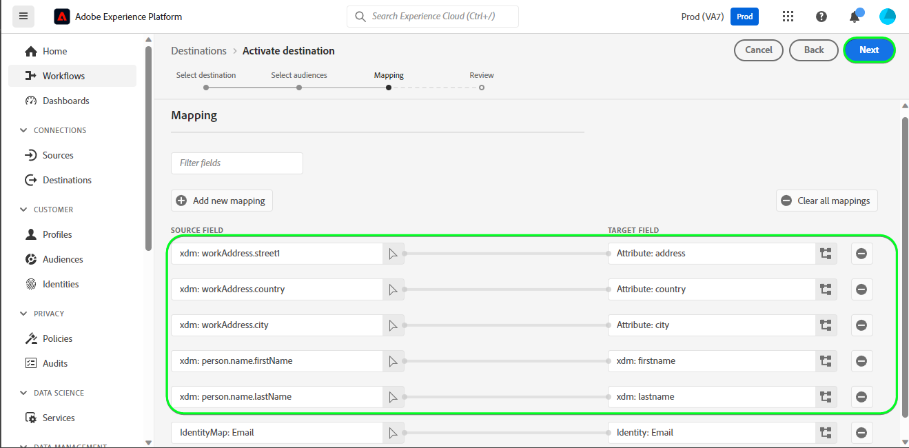 Para enviar corretamente os dados de público-alvo de Adobe Experience Platform para o destino Braze, é necessário passar pela etapa de mapeamento de campos.