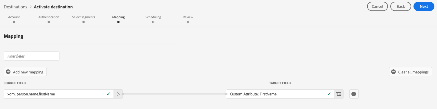 O mapeamento consiste na criação de um vínculo entre os campos do esquema Experience Data Model (XDM) na conta Experience Platform e seus equivalentes correspondentes no destino.