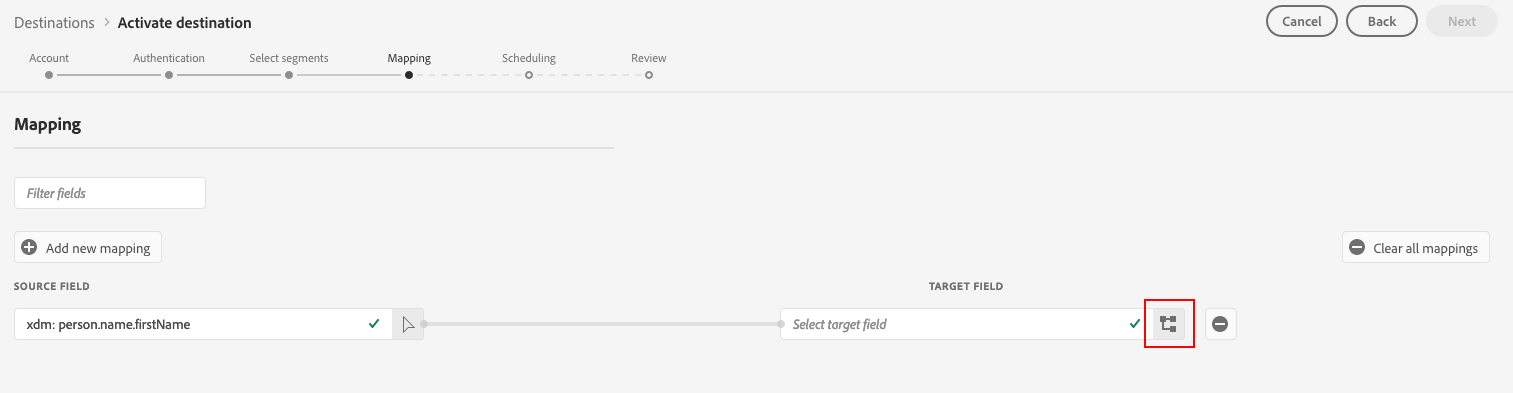 映射包括在Experience Data Model帐户中的Experience Platform (XDM)架构字段及其来自目标目标的对应项之间创建链接。