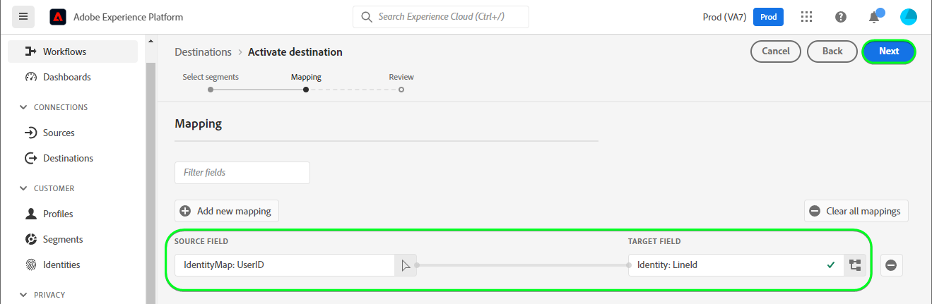 대상 데이터를 Adobe Experience Platform에서 LINE 대상으로 올바르게 보내려면 필드 매핑 단계를 거쳐야합니다. 매핑은 Experience Platform 계정의 XDM(Experience Data Model) 스키마 필드와 대상 대상의 해당 스키마 필드 간에 링크를 작성하는 것으로 구성됩니다. XDM 필드를 LINE 대상 필드에 올바르게 매핑하려면 다음 단계를 따르십시오.