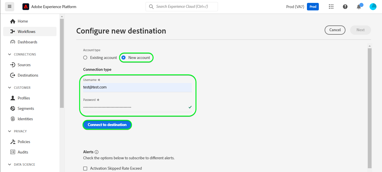 Om du vill ansluta till det här målet följer du stegen som beskrivs i självstudiekursen för destinationskonfiguration. I arbetsflödet för att konfigurera mål fyller du i fälten som listas i de två avsnitten nedan.