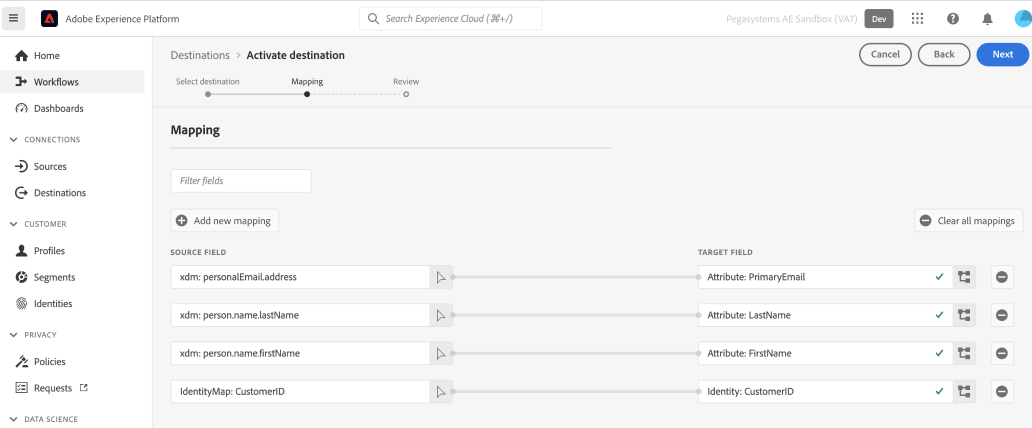 CustomerID名稱空間作為目標身分。 - 選取需要對應至對應XDM來源設定檔屬性的目的地設定檔屬性名稱。