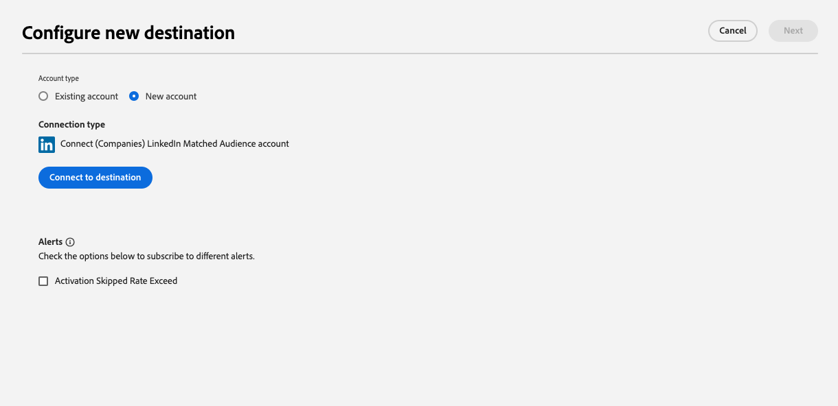 - Zum Aktivieren von Daten benötigen Sie die View Destinations, Activate Destinations, View Profiles und View Segments Zugriffssteuerungsberechtigungen. Lesen Sie die Übersicht über die Zugriffssteuerung oder wenden Sie sich an Ihre Produktadmins, um die erforderlichen Berechtigungen zu erhalten.