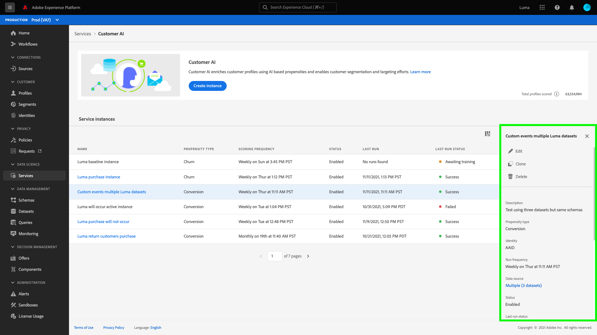 Viene visualizzata la pagina del servizio Customer AI. In questa pagina vengono elencate le istanze del servizio di IA per l’analisi dei clienti e vengono visualizzate informazioni su di esse, tra cui il nome dell’istanza, il tipo di propensione, la frequenza di esecuzione dell’istanza e lo stato dell’ultimo aggiornamento.